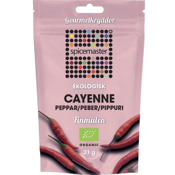 Spicemaster Cayennepeppar passar också bra till såser och soppor, och smakar som en riktig cayennepeppar ska smaka. Cayenne har ett Scovillevärde på 30 000-50 000 SHU (Scoville Heat Unit). Scoville är en skala som används för att mäta den upplevda hettan i chili.