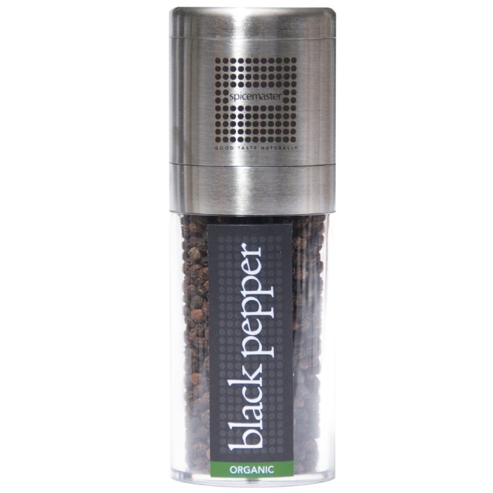 Spicemasters kvarn kan fyllas på, och har ett ställbart keramiskt huvud så du själv kan välja grovlek på kryddan.