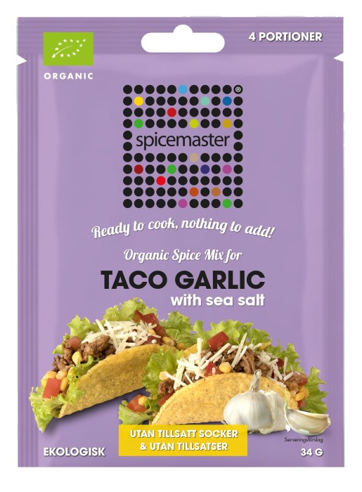 Spicemaster Taco Garlic kryddmix är utan tillsatser, tillsatt socker och stärkelser. Ekologisk.