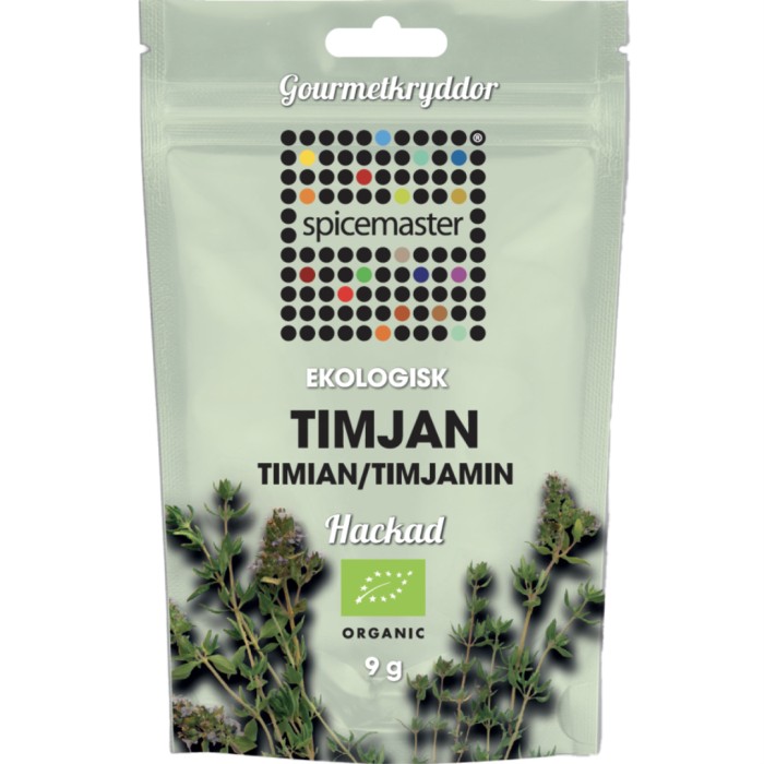 Spicemasters ekologisk timjan har en stark arom och passar bra till kyckling, fisk, kött, marinader, såser och soppor (speciellt till ärtsoppa). Timjan är en vanlig krydda i många Medelhavsländer, och passar bra som baskrydda.