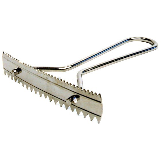 Sprenger Schäferkarda i förnicklat stål med avtagbart blad. Kardan har två rader av sågtänder, en grovtandad och en fintandad. Tar effektivt bort underull på schäfrar och andra hundar med liknande pälstyp, t.ex. labradorer och retrievers. Handtaget är 13 cm.