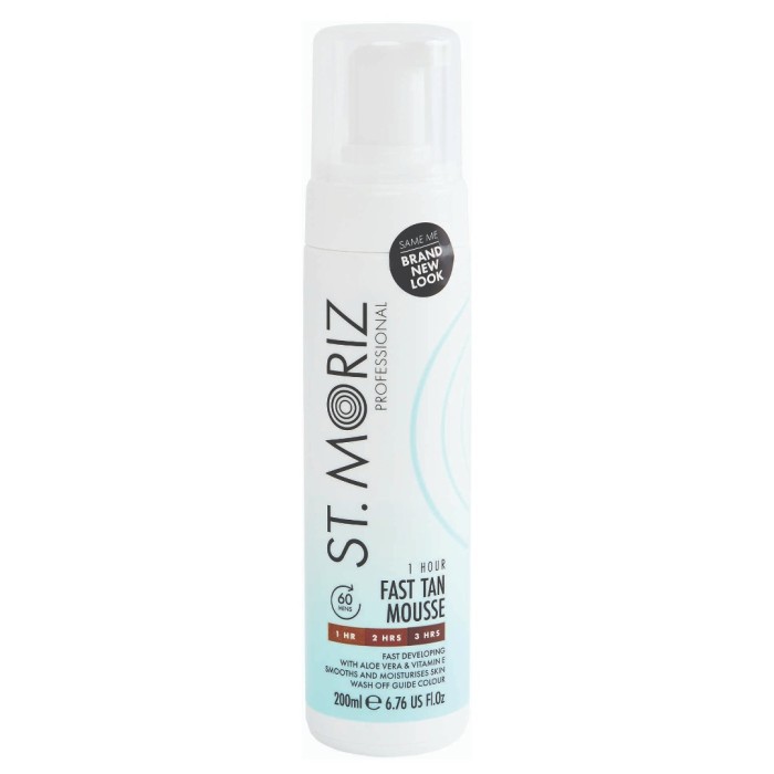 St. Moriz 1 Hour Fast Tan Mousse är en brun utan sol som kan passa dig som vill ha en snabb och kontrollerad solbränna. Efter 1 timme får huden ett fint glow, efter 2 timmar en gyllene färg och efter 3 timmar en djupare ton. 1 Hour Fast Tan Mousse innehåller aloe vera och vitamin E för att göra huden len.