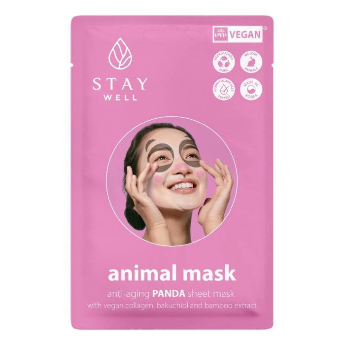 Stay Well Animal Mask Panda är en sheet mask som innehåller antiaging-ingredienserna veganskt kollagen och bakuchiol. Dessa ingredienser hjälper huden att behålla fukt, att minska vattenförlust i huden och att öka hudens elasticitet. Serumet som masken är indränkt i innehåller även bambuextrakt rikt på antioxidanter.