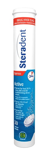 Steradent Active Extress Denture Cleaning Tablets är brustabletter som används för rengöring av tandproteser. Steradent ger tandprotesen en djuprengöring på bara 3 minuter. Lägg tandprotesen och en brustablett i ett glas och fyll på med vatten. Steradent fungerar på ställen där tanborsten inte kommer åt och dödar 99,9% av bakterierna samt tar bort 50% mer plack än vid endast tandborstning.