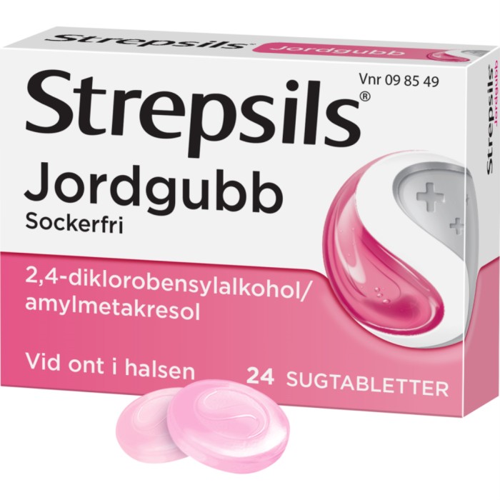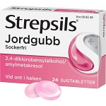 Strepsils Jordgubb är en sockerfri halstablett som används vid lindriga infektioner i munhåla och svalg, till exempel vid ont i halsen. Strepsils Jordgubb har en bakteriehämmande och antiviral effekt.
