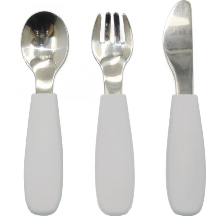 Summerville Barnbestick i rostfritt stål och silikon är greppvänliga och enkla för barnhänder att hålla i. Detta set med bestick för barn innehåller gaffel, kniv och sked och passar bra för lite större barn som ska lära sig äta själva. De mjuka silikonhandtagen ger barnet ett bra grepp och gör att besticken är bekväma att hålla i. Längd: 13 cm.