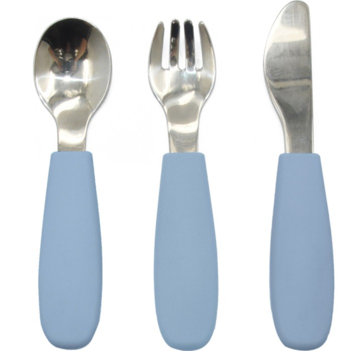 Summerville Barnbestick i rostfritt stål och silikon är greppvänliga och enkla för barnhänder att hålla i. Detta set med bestick för barn innehåller gaffel, kniv och sked och passar bra för lite större barn som ska lära sig äta själva. De mjuka silikonhandtagen ger barnet ett bra grepp och gör att besticken är bekväma att hålla i. Längd: 13 cm.