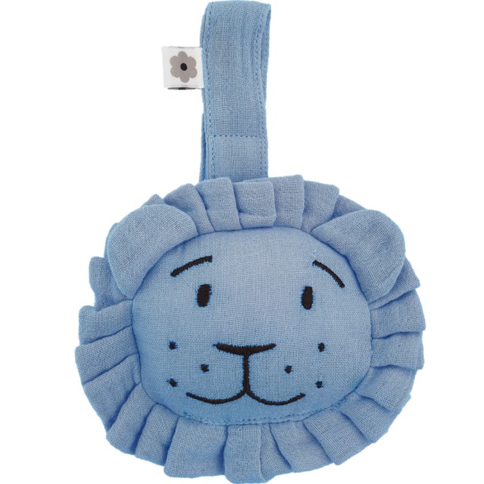En hängande skallra för babyn i form av ett mjukt lejon. Lejonet har en fin man och en liten skallra inuti sig. Denna babyleksak är tillverkad av ekologisk bomullsmuslin. Kardborrebandet gör att skallran enkelt kan hängas i babygymmet, bilbarnstolen, vagnen eller på spjälsängens kant. Yttertyget är av ekologisk bomull och fyllningen av återvunnen polyester.