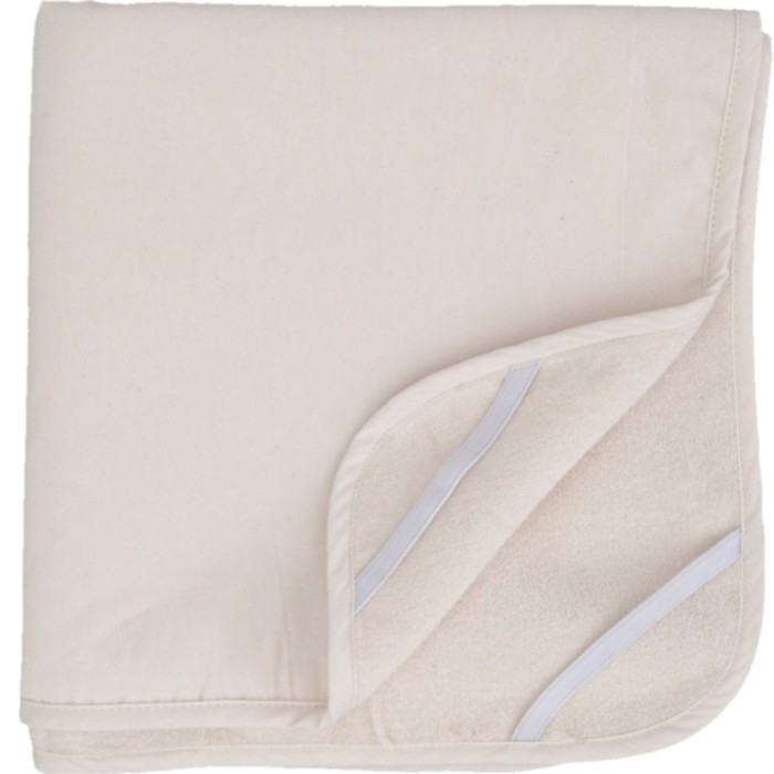 Ekologisk bomull med två lager tyg, ett i bomullspercale och ett i frotté. Ovansidan är behandlad med en acrylcoating för att vara vattenavvisande. Resårband.