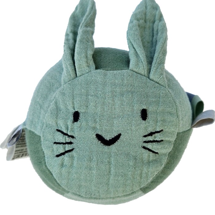 Mjuk bollskallra för babyn i form av en kanin med långa öron. Inuti finns en liten skallra som ger ett plingande ljud när man leker med bollen. Den söta mjuka skallran är designad för små händer, och är enkel för babyn att greppa och hålla i. Yttertyg av ekologisk bomull och fyllning av återvunnen polyester.