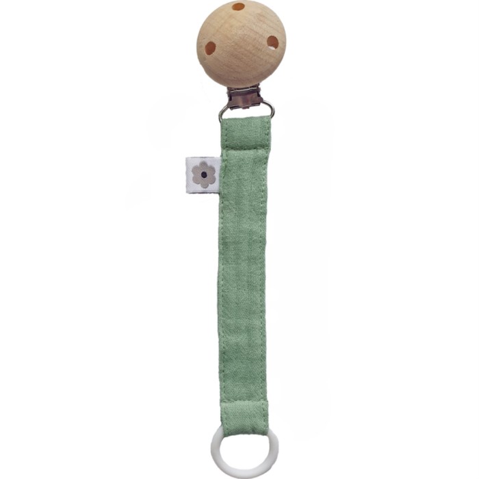 Napphållare i ekologisk bomullsmuslin som håller rätt på barnets napp, så att den inte tappas bort eller hamnar på golvet. Bomullen i muslintyget är ekologiskt och träet i spännet är FSC-certifierat bokträ. Det rostfria spännet är gjort i nickelfritt stål och har en ring av silikon. CE-märkt produkt som uppfyller EN 12586:2007 A1:2011.