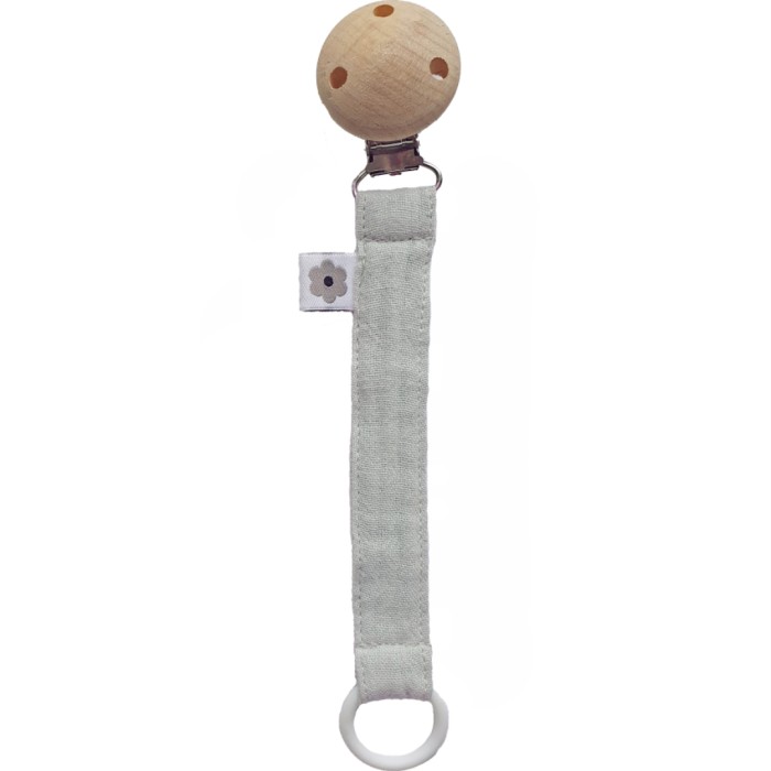 Napphållare i ekologisk bomullsmuslin som håller rätt på barnets napp, så att den inte tappas bort eller hamnar på golvet. Bomullen i muslintyget är ekologiskt och träet i spännet är FSC-certifierat bokträ. Det rostfria spännet är gjort i nickelfritt stål och har en ring av silikon. CE-märkt produkt som uppfyller EN 12586:2007 A1:2011.