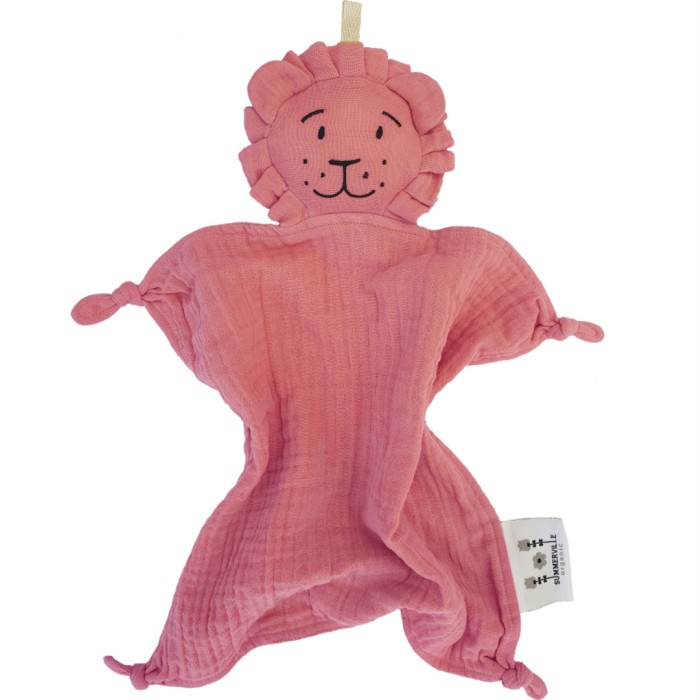 Summerville Snuttefilt Lejon är en gosig vän när barnet ska sova, och en mjuk, söt snuttedocka att leka med. Lejonet har en fin man och knutar i ändarna som kan vara spännande för barnet att känna på och hålla i, eller känna på när det är dags att komma till ro. Snuttefilten är tillverkad i mjuk, ekologisk bomullsmuslin och har en fyllning av polyester. Storlek ca 40 x 30 cm.