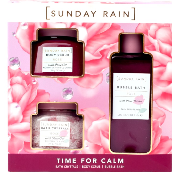 Blossom Rose Trio är en presentförpackning från Sunday Rain för en lyxig badupplevelse. Kitet innehåller ett bubbelbad, badkristaller samt en sockerskrubb. Innehåller rosolja för att återfukta huden och främja en jämn hudton. Så ta ett lugnande bad med rosendoftande badkristaller och bubbelbad, och polera försiktigt huden slät med den väldoftande peelingen.