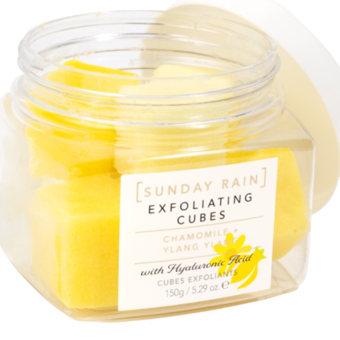 Chamomile & Ylang Ylang Exfoliating Cubes från Sunday Rain är skrubb-kuber för exfoliering som mjukar upp huden. Kuberna innehåller naturligt socker och lugnande kamomill, och hyaluronsyra som ger huden återfuktning.