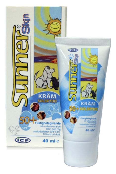Sunner Skin är en kräm med hög solfaktor (SPF 50) för hund och katt. Sunner Skin används vid UV-exponering för att förhindra skador av solen UV-strålar. Krämen är fuktighetsgivande och har vattenavvisande egenskaper.
