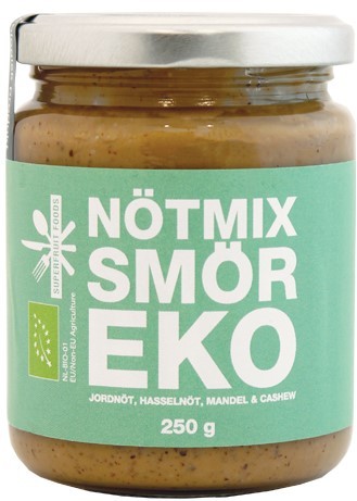 Superfruit Foods ekologiska nötsmörsmix är gjord på jordnötter, hasselnötter, mandel och cashew.