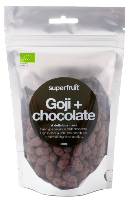 84% Mörk choklad (socker, kakaomassa, kakaosmör, sojalecitin, naturlig vanilj, glukossirap, maltodextrin, shellac), 16% gojibär.