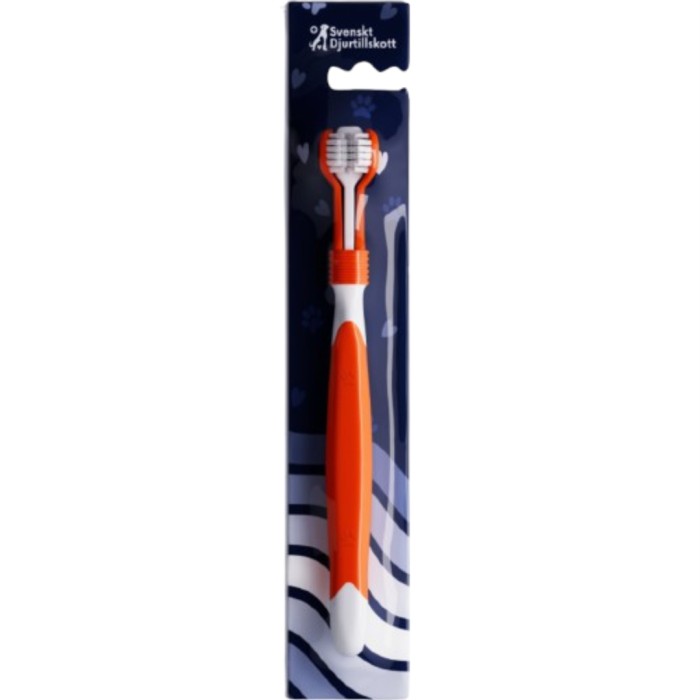 Svenskt Djurtillskott Hundtandborste har ett unikt tredelat borsthuvud som effektivt rengör alla ytor på tänderna från flera vinklar samtidigt. Regelbunden tandborstning kan hjälpa till att minska risken för plack, tandsten och dålig andedräkt.
