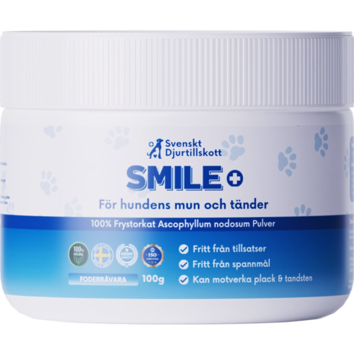 Smile+ från Svenskt Djurtillskott är ett naturligt fodertillskott som kan stötta hundens mun och tandhygien. Tillskottet kan hjälpa till med att förbättra förhållandena i hundens mun för att upprätthålla en bättre munhygien och kan motverka plack, tandsten och dålig andedräkt.