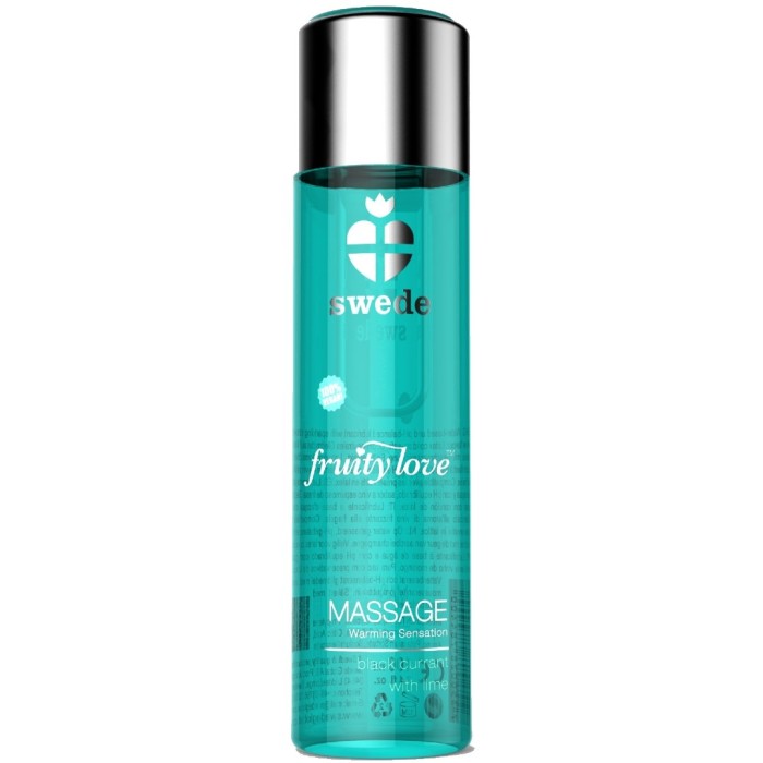 Fruity Love Massage från svenska Swede är en serie värmande, smaksatta massagelotioner för användning på huden. Den vattenbaserade lotionen är hudvänlig och ofarlig att förtära. Massagelotionen har en fin balans mellan glid och friktion som varar länge och lämnar inte någon oljig känsla på huden. Lotionen upplevs värmande på huden och blåser du på den känns den ännu lite hetare.