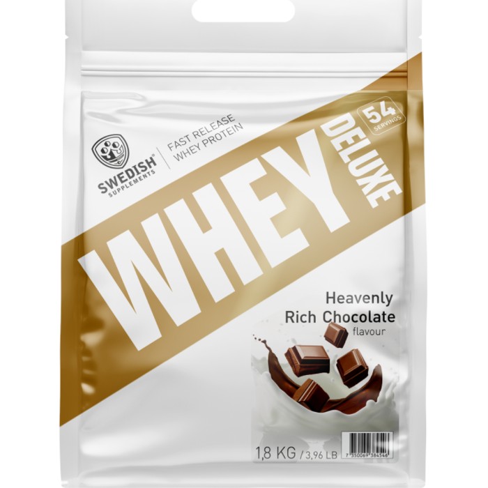 Whey Protein Deluxe från Swedish Supplements består av ett högkvalitativt vassleproteinkoncentrat samt isolat. Vassleprotein har ett komplett innehåll av livsnödvändiga aminosyror och ett naturligt högt innehåll av de muskeluppbyggande grenade aminosyrorna BCAA. Whey Protein Deluxe kan tas om du vill öka dagens totala proteinintag, och för att hjälpa kroppen att återhämta sig efter träningspasset.