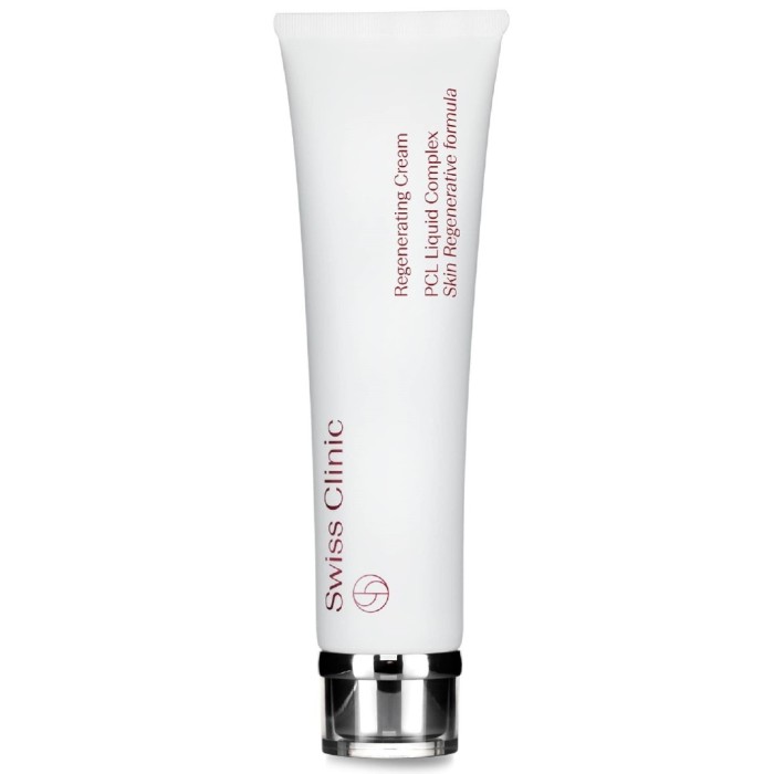 Swiss Clinics Regenerating Cream innehåller den aktiva ingrediensen PCL, en tunn olja som bidrar till att öka elasticiteten i huden och att bevara hudens naturliga fuktbalans. Krämen bidrar till att göra smärre skavanker i huden mindre synliga och gör att huden känns mjuk och smidig.