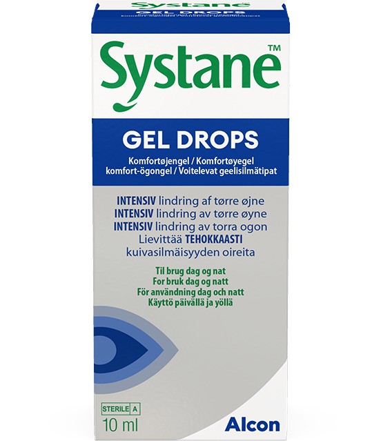 Systane Gel Drops är smörjande ögondroppar som ger lindring för torra ögon under natten. Systane Gel Drops har en unik verkningsmekanism för att ge hög komfort och en förstärkt smörjande effekt, som varar under lång tid. Ögondropparna passar för applicering under dagen och natten och lindrar måttliga till svåra ögonsymtom på grund av torra ögon, t.ex. obehag, sveda och irritation.