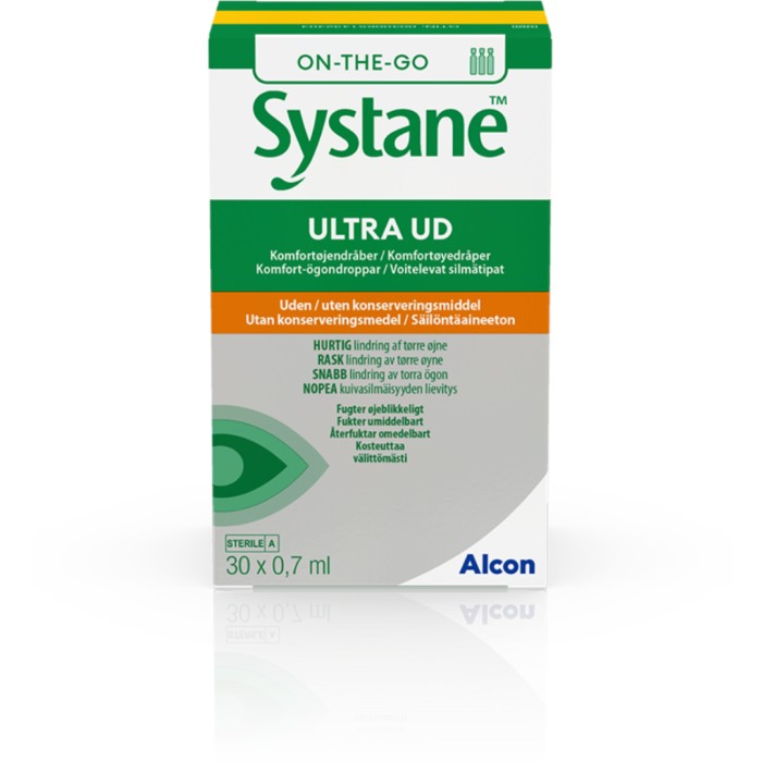 Systane Ultra är ögondroppar för torra eller irriterade ögon, där torrhet orsakas av yttre faktorer, t ex skärmtid eller luftkonditionering. Systane Ultra smörjer, skyddar och ger snabb lindring till torra ögon. Kan användas även när du bär med kontaktlinser.