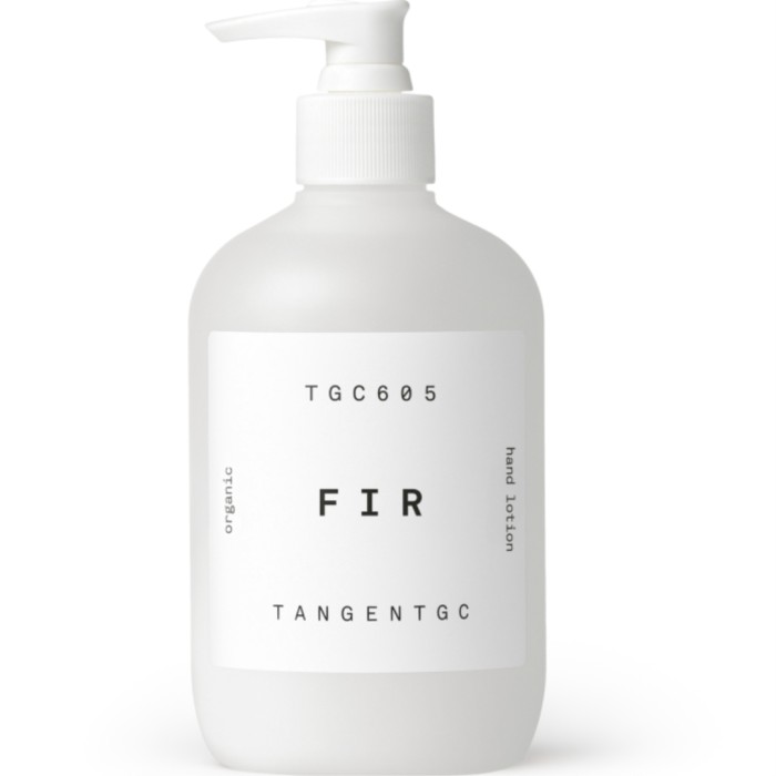 Fir Hand Lotion från märket Tangent GC är en handkräm med doft av gran. Krämen har en långtidsverkande formulering som verkar både på ytan och djupet. Formuleringen bygger på NMF (Natural Moisturizing Factors), som är ämnen som finns naturligt i huden har bevisad effekt. Handlotionen innehåller AHA, glycerin och E-vitamin. Lotionen återfuktar huden och gör händerna mjuka.