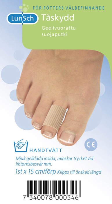 Tåskydd från LunSch med gelklädd insida. Består av en 15 cm lång tub som klipps till önskad längd och sedan träs på de tår du vill skydda. En storlek, mycket elastiska. Handtvätt.