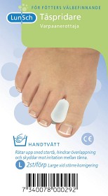 Tåspridare från LunSch i stor storlek. En tjock tåspridare som läggs mellan stortån och andratån för att undvika överlappning samt hjälper tårna till rätt placering. Bra hjälpmedel vid exempelvis Hallux Valgus. 2 st/förpackning. Handtvätt. Storlek large.