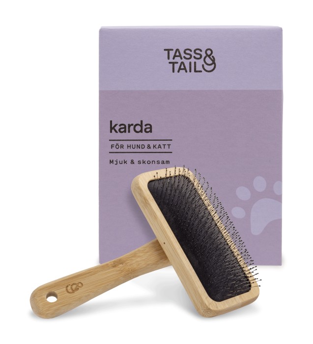 Tass & Tails karda reder ut tovig päls och tar bort löst hår och underull på hund och katt. Kardan har plastknoppar för att göra borstningen mjuk och skonsam för djuret.