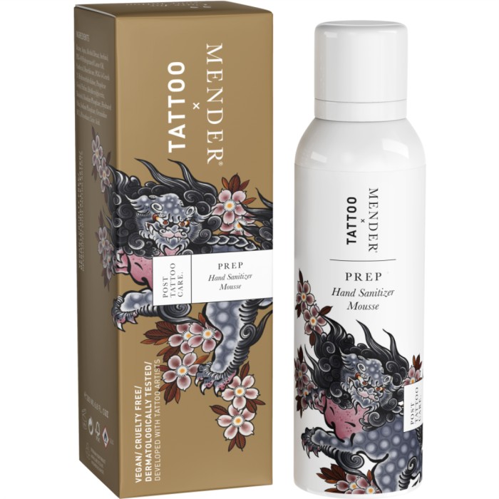 Prep Hand Sanitizer Mousse från Tattoo Mender är en svalkande mousse som har utvecklats specifikt för att förbereda händerna för att hantera tatuerad hud. Moussen har en unik formulering som rengör och mjukgör händerna på samma gång. Ingredienserna, som inkluderar prebiotika, ricinolja, provitamin B5, kamomillextrakt, antioxidanter och C vitamin, har noga valts ut för sina fördelaktiga egenskaper när de används vid upprepad handhygien. Vegansk, cruelty free, dermatologiskt testad och utvecklad med tatuerare.