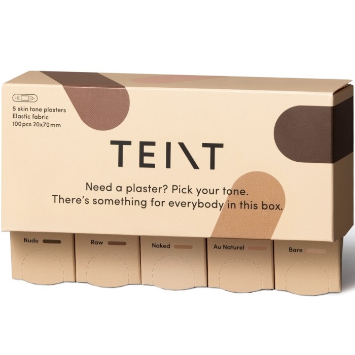 Denna förpackning innehåller alla fem nyanser av Teint plåster, 20 st av varje. Plåstren har storleken 20x70mm.