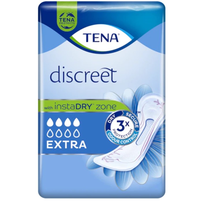 TENA Discreet InstaDRY är läckagesäkra, bekväma och diskreta skydd för medelstora urinläckage vid trängnings-eller blandinkontitens. Andningsbara.