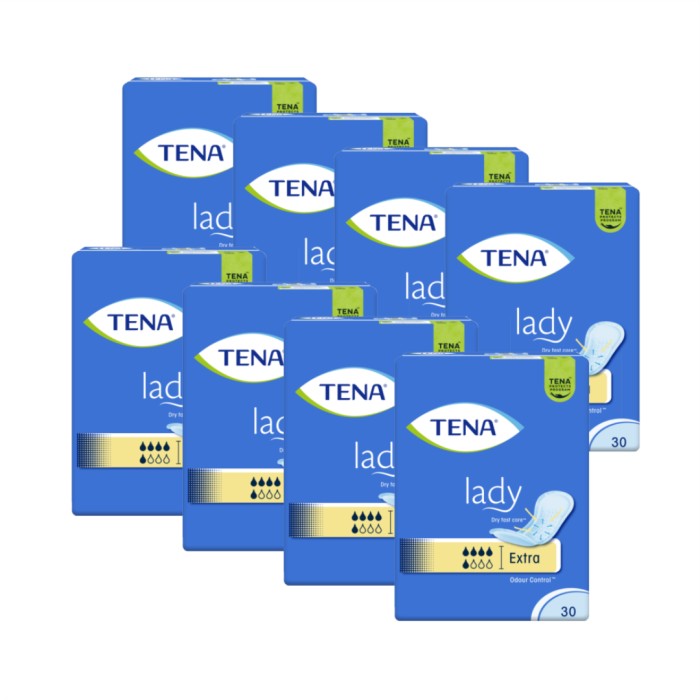 Detta är ett storpack TENA Lady Extra 8 x 30 st, totalt 240 st skydd.