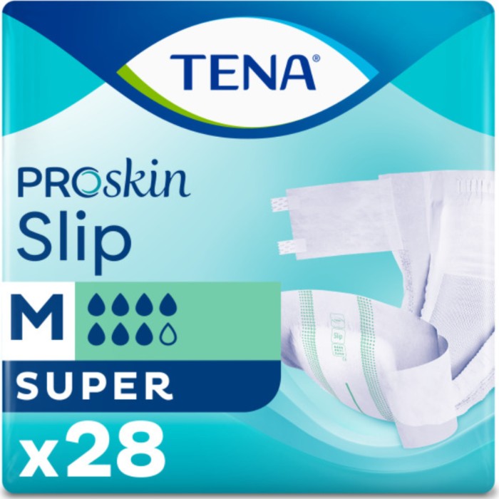 Tena ProSkin Slip Super Medium är ett allt-i-ett-skydd för mycket stora urinmängder. För maximal läckagesäkerhet vid t ex oroliga/plockiga eller sängliggande vårdtagare. Ingen separat fixeringsbyxa behövs. Justerbar tejp för rätt fixering. Andingsbart ytskikt med textilliknande baksida. Läckagebarriär ger ökad läckagesäkerhet. Våtindikator underlättar val av rätt uppsugningsförmåga.
