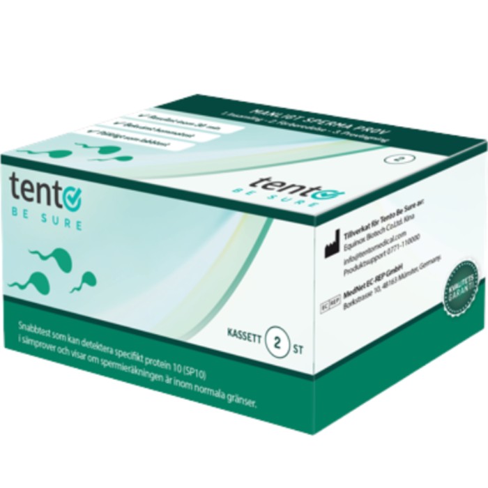 Tento Be Sure Spermattest är ett snabbtest som mäter koncentrationen av spermier i sädesvätskan och detekterar om den är normal eller nedsatt. Tento Be Sure Spermattest kan detektera specifikt protein 10 (SP10) i prover. Testet är enkelt att använda och avsett för självtestning. Resultatet är antingen positivt eller negativt och visar om spermie-räkningen är inom normala gränser
