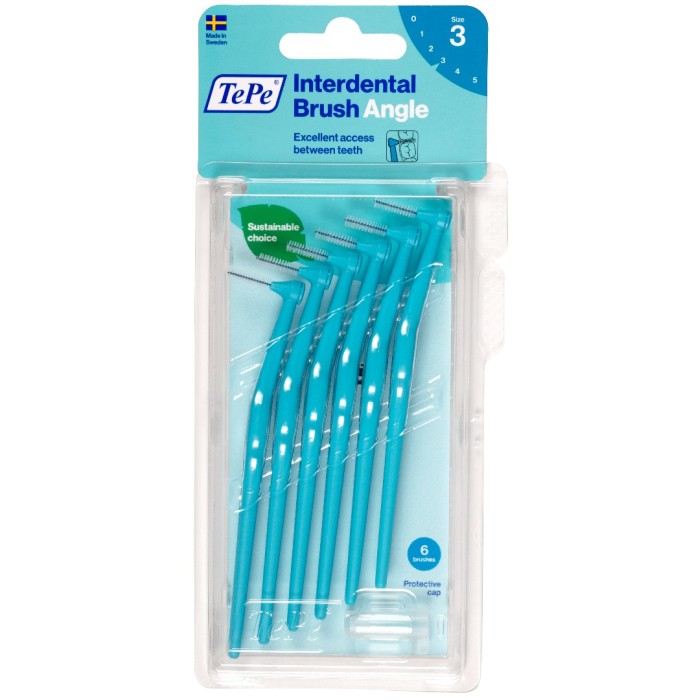 TePe Angle är en mellanrumsborste med litet vinklat borsthuvud och långt skaft för effektiv rengöring av alla tandmellanrum. TePe Angle rengör även svåråtkomliga områden där en vanlig tandborste inte kommer åt. Det långa skaftet ger åtkomst även till ytor längre bak i munnen. Använd dagligen för att bidra till friska tänder och ett friskt tandkött. Ett hygieniskt skydd för borsten medföljer.
