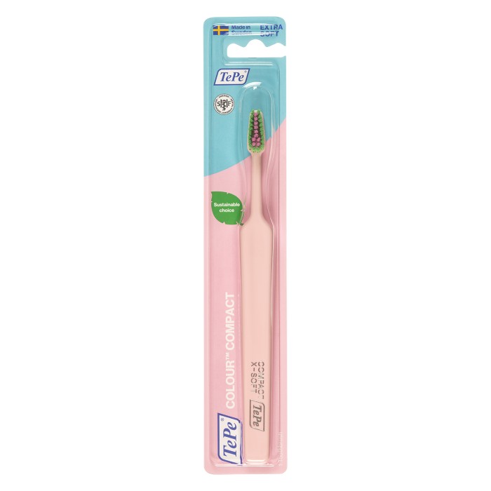 TePe Colour Compact Extra Soft är en enkel och användarvänlig tandborste som kan användas av vuxna och ungdomar. Tandborsten har ett avsmalnande borsthuvud för att komma åt bra, och de topprundade och extra mjuka borststråna ger en skonsam rengöring. Skaftet kan vinklas om du värmer upp det i varmt vatten.