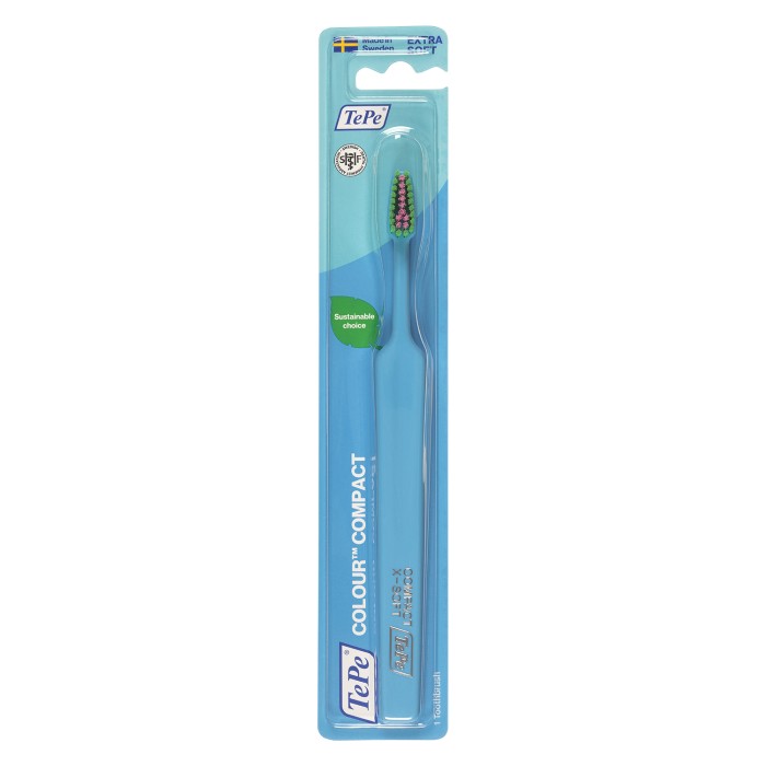 TePe Colour Compact Extra Soft är en enkel och användarvänlig tandborste som kan användas av vuxna och ungdomar. Tandborsten har ett avsmalnande borsthuvud för att komma åt bra, och de topprundade och extra mjuka borststråna ger en skonsam rengöring. Skaftet kan vinklas om du värmer upp det i varmt vatten.