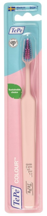 TePe Colour Soft är en enkel och användarvänlig tandborste som kan användas av vuxna och ungdomar. Tandborsten har ett avsmalnande borsthuvud för att komma åt bra, och de topprundade mjuka stråna ger en skonsam rengöring. Skaftet kan vinklas om du värmer upp det i varmt vatten.