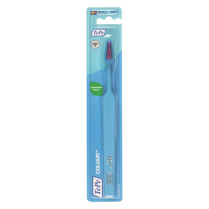 TePe Colour Soft är en enkel och användarvänlig tandborste som kan användas av vuxna och ungdomar. Tandborsten har ett avsmalnande borsthuvud för att komma åt bra, och de topprundade mjuka stråna ger en skonsam rengöring. Skaftet kan vinklas om du värmer upp det i varmt vatten.
