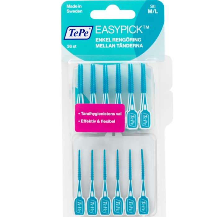 TePe EasyPick är en tandpetare med ett stadigt skaft och silikonlameller för att effektivt göra rent mellan tänderna. Tandpetaren är så flexibel att du enkelt kommer åt både mellan de främre och de bakre tänderna.