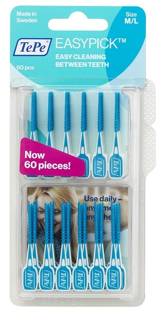 TePe EasyPick är en tandpetare med ett stadigt skaft och silikonlameller för att effektivt göra rent mellan tänderna. Tandpetaren är så flexibel att du enkelt kommer åt både mellan de främre och de bakre tänderna.