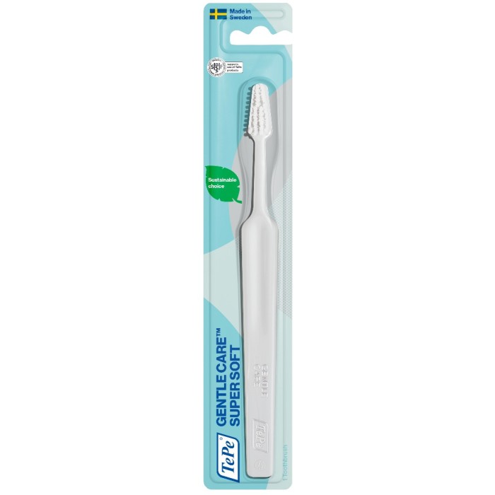 TePe Gentle Care är en supermjuk tandborste som rekommenderas för patienter efter oral kirurgi eller de med extra känsliga tänder eller slemhinnor.
