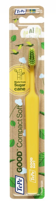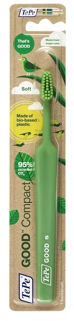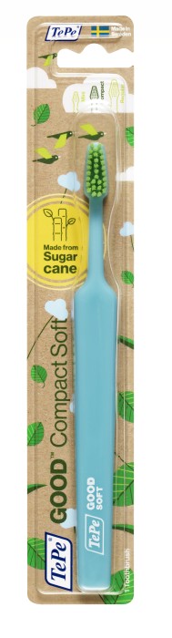 TePe GOOD Compact Soft är en svensktillverkad tandborste. Tandborstens skaft är gjort av 96% biobaserat material och stråna är 100% biobaserade.