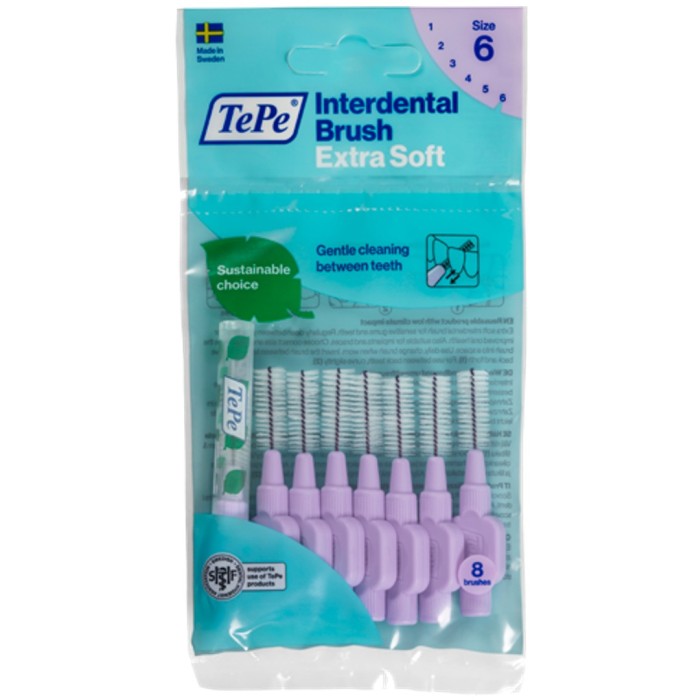 TePe Extra Soft är en mjuk mellanrumsborste för känsliga tänder och ömtåligt tandkött. Mellanrumsborsten gör rent mellan tänderna där tandborsten inte kommer åt. Att regelbundet göra rent med en mellanrumsborste kan förebygga tandköttsinflammation, karies och dålig andedräkt. TePe Mellanrumsborste har extra mjuka strån av högsta kvalitet för en effektiv och skonsam rengöring. Framtagen i samråd med tandvårdsexpertis för att säkerställa bästa funktion. I påsen finns 8 borstar och en skyddshylsa, som även kan användas som skaftförlängare.