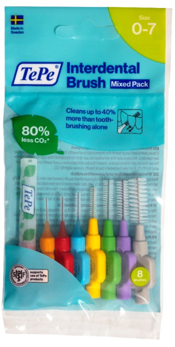 TePe Mellanrumsborstar Mixpack innehåller 8 borstar i olika storlekar. TePe Mellanrumsborstar har ett unikt fast skaft som ger ett stabilt och stadigt grepp och gör borsten lätt att använda. Alla TePes mellanrumsborstar har en plastöverdragen metalltråd för säker rengöring.